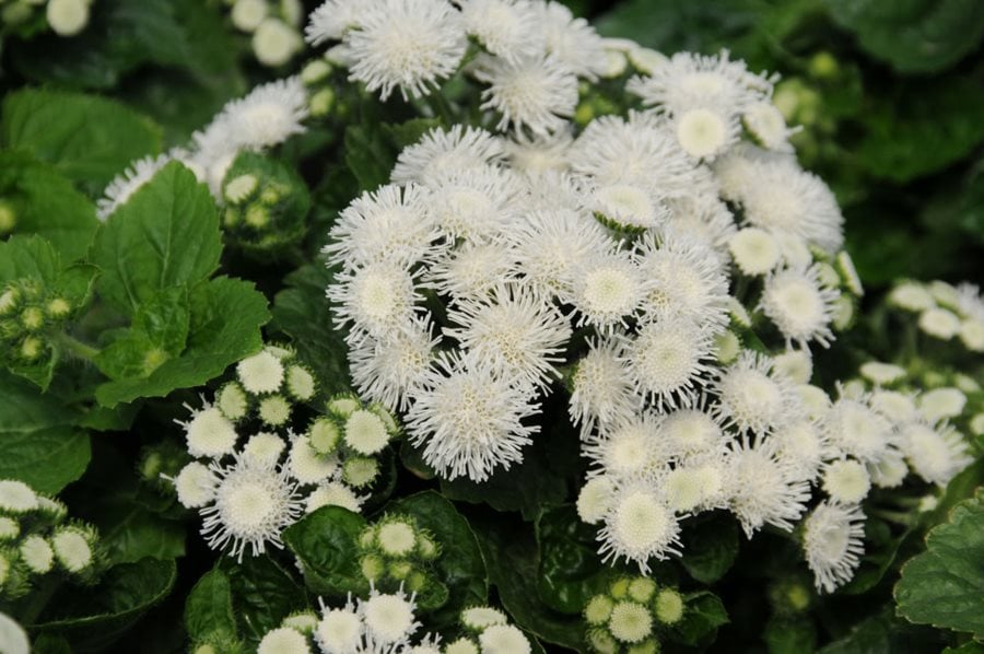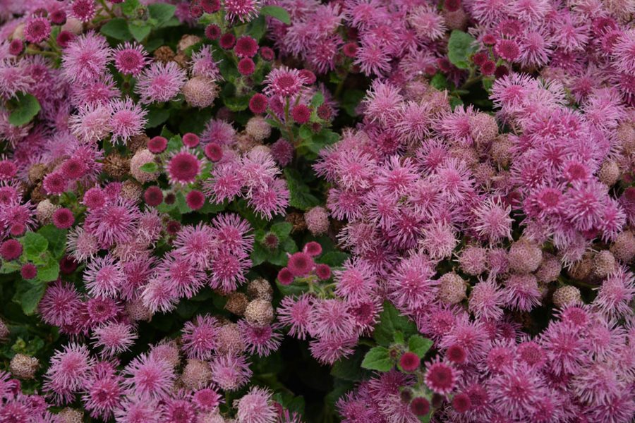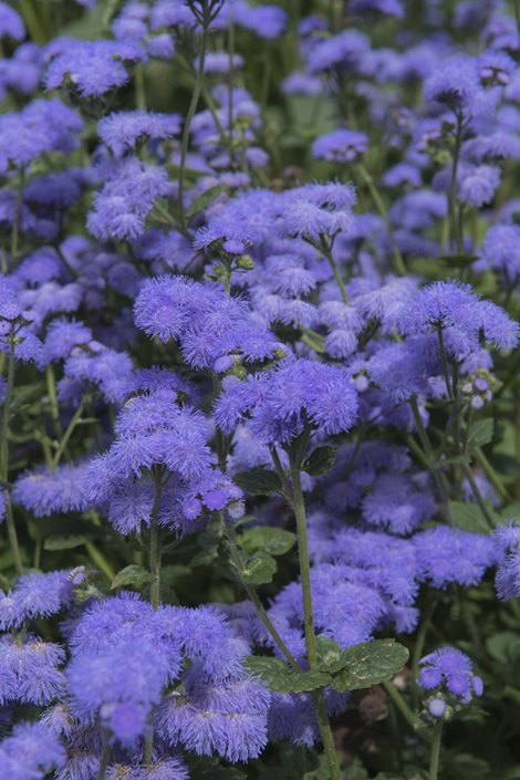 Commonly known as floss flower, this member of the Aster family includes 40 species of annuals, perennials, and shrubs native to tropical and subtropical regions of North and South America. Billygoat weed (Ageratum conyzoides), which has herbal and medicinal qualities, is highly invasive, primarily in Africa, but can also be found growing wild in parts of the Southern US. The ornamental varieties available to home gardeners are grown as annuals, and are attractive to butterflies, hummingbirds, and insect pollinators.