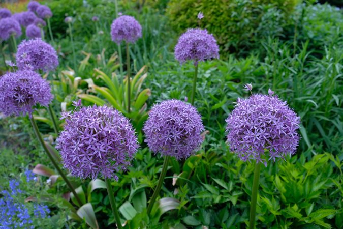 - Alliums make great “mixers” among other border plants, and many can be planted to come up through lower-growing perennials like catmint and cranesbill geranium, which also hide fading bulb foliage.