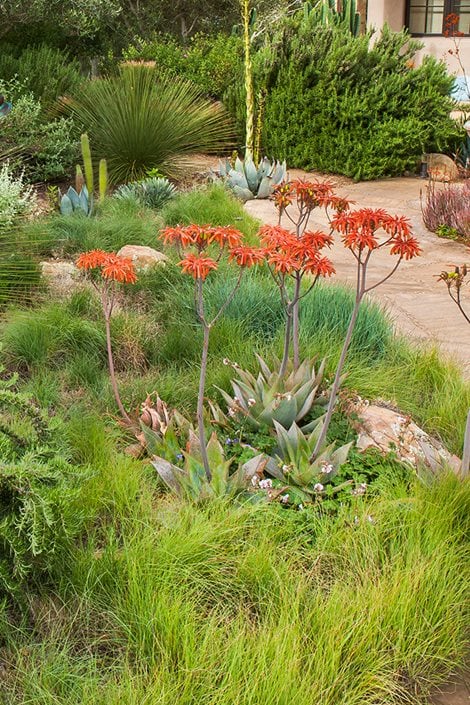 - Plant with companion plants like succulent ground covers, agaves, prickly pear, spurge and other waterwise or drought-tolerant plants.