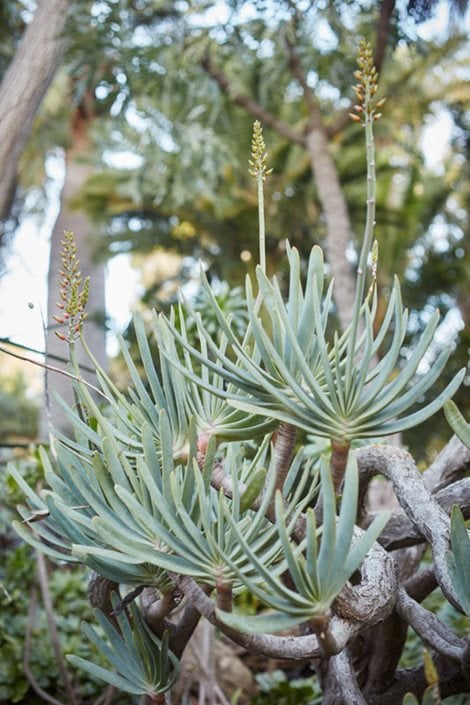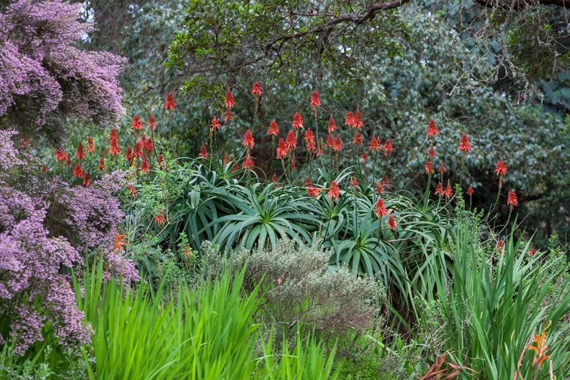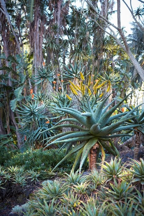 Once established, aloes require very little care. If a tree-like species develops a “petticoat” of old foliage, it’s best to leave the drooping leaves as they protect the trunk from temperature extremes and sunburn.