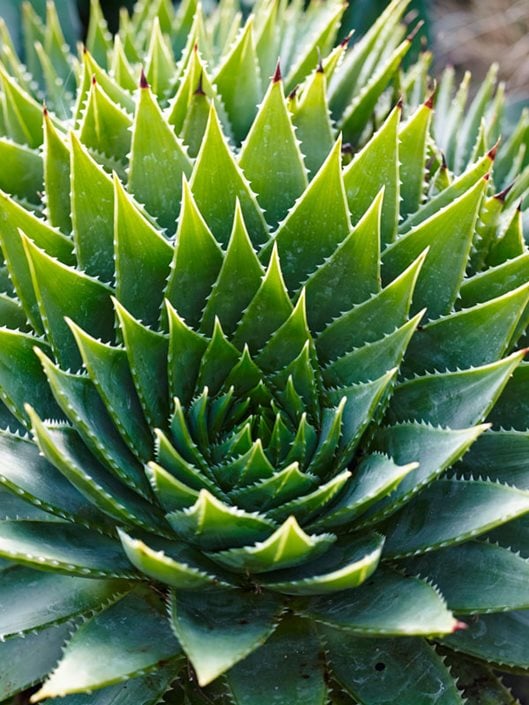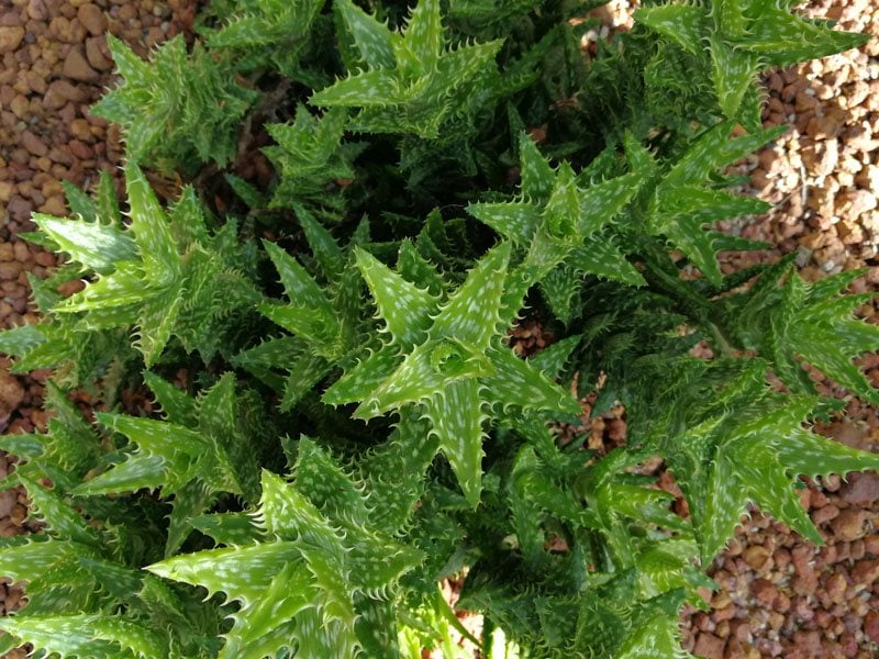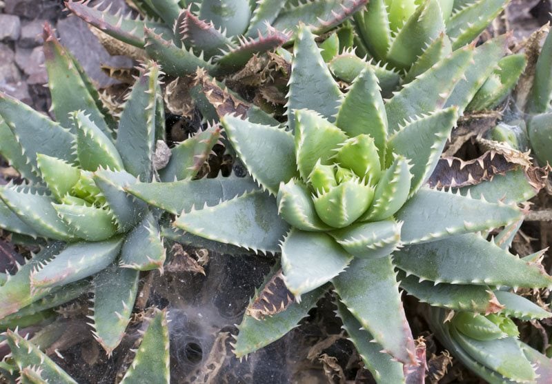Aloes and agaves look very similar, making them difficult to tell apart; however, there are a few differences. Aloe leaves have fleshy centers and Agave are more fibrous. Agaves have sharp teeth along their edges with a line of demarcation. The teeth on Aloe leaves are actually extensions of the leaf, without any delineation. Mature Aloe plants bloom every year, while most Agave bloom only once, later in their lives, and then slowly die. Their care is very similar, so if you do get them confused, chances are you won’t kill them.