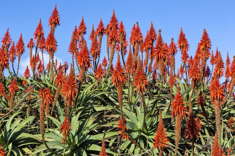 Aloe have tubular flowers that bloom in clusters on tall stalks that shoot up above the foliage. Flowers are mainly shades of orange, red or yellow, and occasionally cream, pink, green or white. Their sword-shaped leaves can be straight or curved and have serrated edges, or “teeth.” When stressed by cold, drought, too much sun, or even extremely poor soil, leaves may develop red or orange coloring along the edges or throughout.