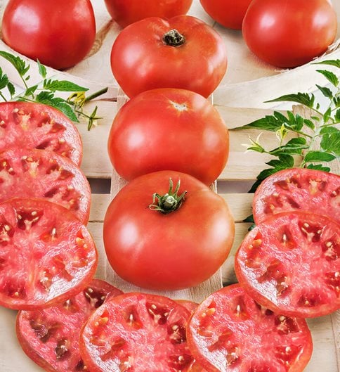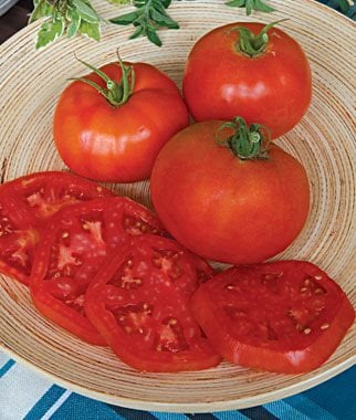 This classic hybrid variety is one of the most popular beefsteak types, with large rich red fruits weighing 10-16 oz. Vigorous plants produce blemish-free, crack-resistant fruits. Peak yield is mid-season, with continuous fruiting into fall. Needs good support. Use for sandwiches, salads, and caprese or cooked as spaghetti sauce.