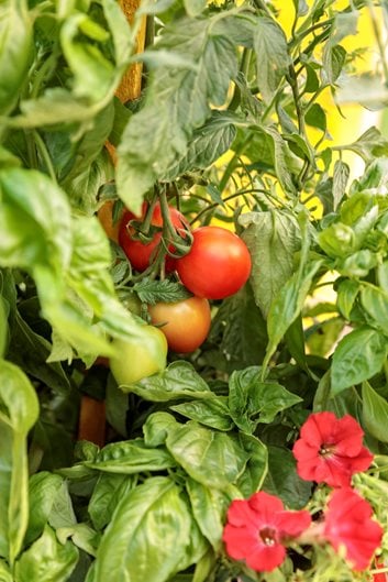 Use determinate trailing types that have been proven to grow well in hanging baskets and small containers. These include ‘Tumbler’, ‘Maskotka’, ‘Red Robin’ and ‘Balconi Red’.