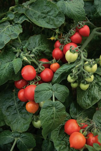 The snack-sized fruit was developed to have rich heirloom taste with modern disease-resistance, short-season maturity, and high yields. Firm, juicy fruit has a smooth, well-balanced flavor and is good for snacking, salads, and roasting. Grow in a container, raised bed or vegetable plot; needs staking or caging.