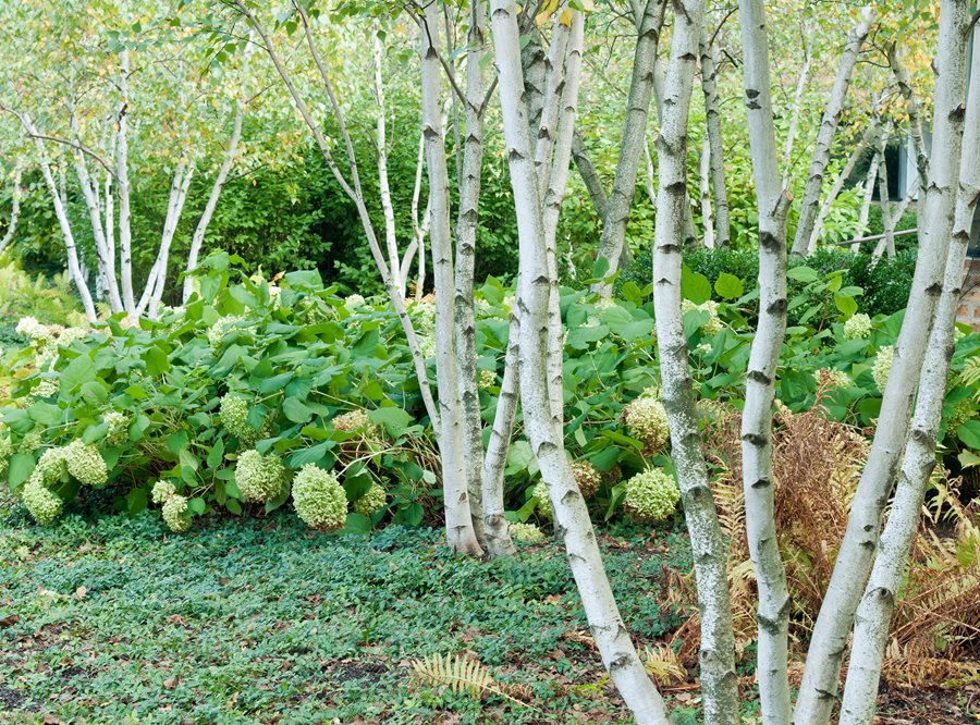 You can plant birch trees in groups or as single specimens, depending on the space available and your design intent. “There are no strict rules about planting distances, and if space is limited, three trees planted in the same hole can create an effective mini copse,” says Bartlett. If you prefer a multi-trunked tree but can’t find one at a local nursery, he suggests creating the same effect by planting three trees in one hole with their roots almost touching. As the group matures, the trunks will eventually touch at the base.
