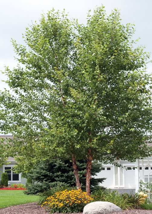 This iconic tree of the northeastern U.S. is the one you’re likely to think of when a birch comes to mind. Its pristine white bark and golden yellow fall color have made it the most widely grown birch in North America. It is often multi-trunked, which only amplifies the beauty of the distinctive bark. Becomes more susceptible to bronze birch borer when planted out of it's range.