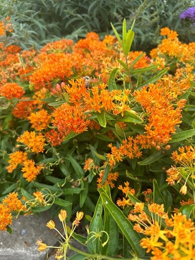 In the “Pretty Path” area of the garden, a stone walkway allows Tracy and visitors to meander next to self-seeding orange butterfly weed, ‘Denim 'n Lace’ Russian Sage, and zinnias in a variety of bright colors. Photo by:Linda Hagen