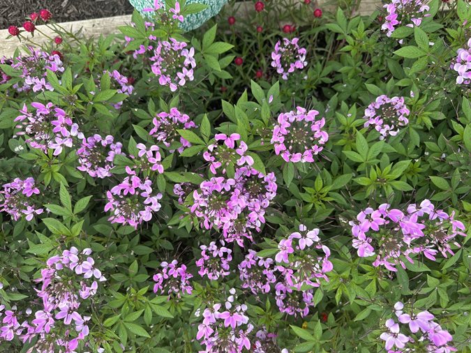 A colorful container on Tracy’s patio bursts with colorful purple, yellow, red, and pink blooms. (For obvious reasons, Tracy refers to this as her “Skittles” container.) Four huge leaves of elephant’s ear rise above the bright combination. Photo by: Linda Hagen