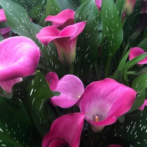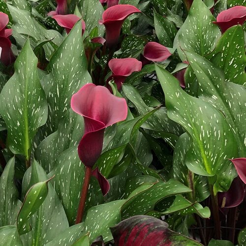Calla lily is an herbaceous or semi-evergreen perennial grown from rhizomes. Tubular-shaped flowers with pointed tips produce a long, finger-like spadix at the center. Calla lily flowers come in a range of colors, including white, yellow, orange, pink, red, purple, green, and even black. Tall elegant stems rise above broad solid green or speckled leaves.