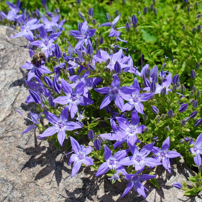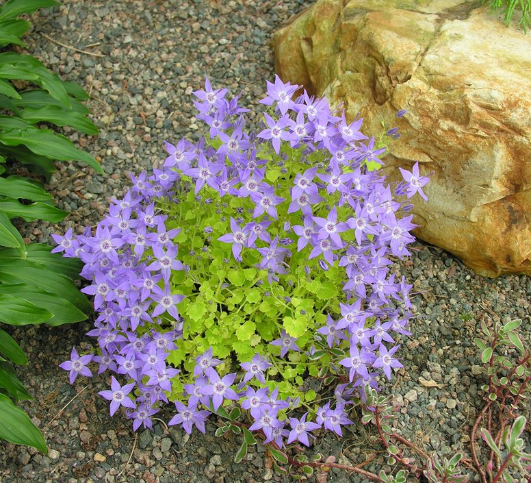 - Plant trailing campanula along a rock wall and allow it to cascade over the edge.