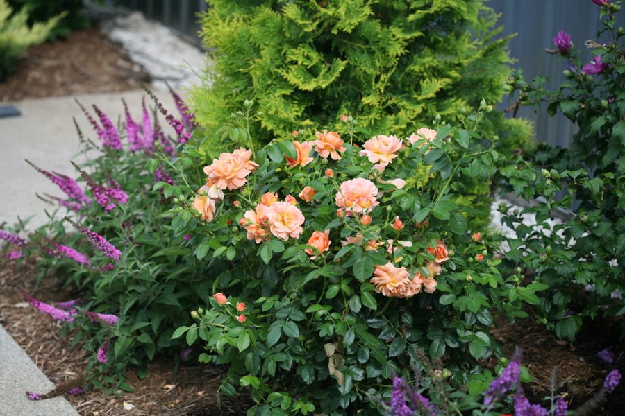 When paired with roses, the spiky purple flowers of salvia (ornamental sage) add delightful diversity in color and form. The aromatic flowers and foliage are also magnets for hummingbirds, butterflies, and other pollinators. Learn more about growing salvia.
