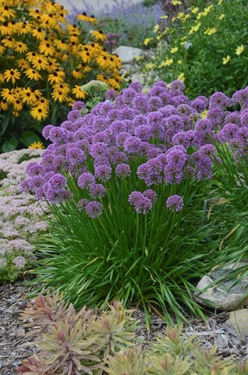 Like other members of the onion family, including chives and garlic, these globe-shaped beauties have a strong scent that wards off aphids. They also attract beneficial insects, such as parasitic wasps and hoverflies, that help keep insect pests under control. Learn more about growing allium flowers.