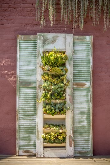 Loyola enjoys the challenge of planting succulents in architectural salvage. To create containers for plants in the hollowed-out center section of an old door, he cut plastic rain gutters to fit. After drilling drainage holes, he painted the gutters butter yellow, which disguises their original function while giving them prominence and making them integral to the composition. Small rosette succulents tucked into the troughs include Aeonium, Sedum, and Echeveria. Growing in 2 to 3 inches of soil is adequate, he says, and “helps them stay small.” He lightly spray-painted the shutters moss green and then sanded to lend a finishing touch.