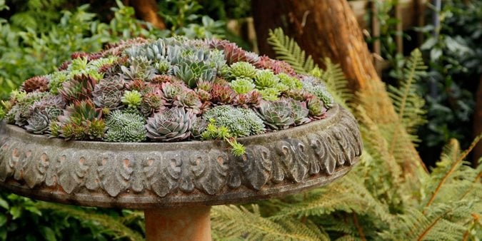 Todd Holloway drilled four large drainage holes in a client’s cast-concrete birdbath, and then transformed it into a garden focal point with white-webbed Sempervivum arachnoideum (cobweb houseleek), several Sempervivum cultivars, and feathery Sedum ‘Angelina’. Photo by: Todd Holloway.