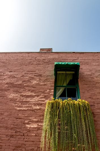 When Peter Loyola acquired his outdoor café’s alley-like space, he saw it not as a characterless rectangle below a looming two-story wall, but rather a canvas awaiting three-dimensional works of living art. He decided to subdue the wall’s “screaming red brick” with trailing Senecio radicans (fish hooks) planted in a window box along with Aeonium rosettes. The green of the succulents contrasts with the bricks, and the multiple strands of the Senecio suggest a waterfall. Evidently it loves this location: “In 10 months, I had to trim it four times,” Loyola says. “If you’re looking for length, fish hooks is the perfect choice.”