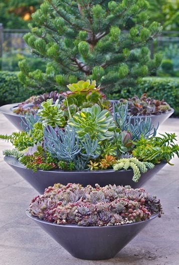 It’s an investment to obtain several of the same or similar containers, but echoing shapes and colors invariably enhances outdoor living areas. And when grouped, such pots create a focal point. The simple lines and neutral, gunmetal-gray color of this trio by Holloway display the succulents they contain without upstaging them. In two are hens and chicks, which will overwinter outdoors in Vancouver. The middle pot is replanted annually; it showcases green and variegated Aeonium cultivars, blue Senecio mandraliscae, Crassula, and Sedum. Succulents benefit from warmth radiated from the hardscape, and don’t drop much leaf litter—a good thing, because these are poolside pots.