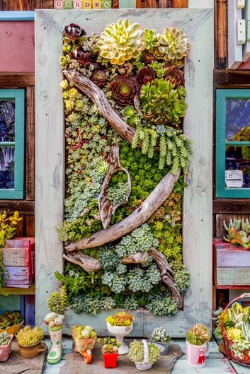 For this 34-by-62-inch vertical garden, Loyola painted a wooden frame pale green, then sanded it to reveal its imperfections. He lined it with a 2-inch-thick sandwich of potting soil and burlap, held in place (front and back) with 18-gauge chicken wire. Driftwood both enhances the design and helps keep the soil from slumping. Using a pointed chopstick to make holes in the burlap, Loyola planted the arrangement (laid flat) with cuttings of Echeveria, Sempervivum, Aeonium, small Crassula, Graptopetalum, and Sedum (notably burro tail). A few weeks later, when roots had anchored the plants, he positioned the planted frame upright.