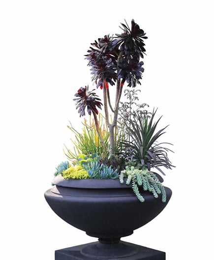 Although another designer might have snapped off the heads of this leggy Aeonium ‘Zwartkop’ (syn. Aeonium ‘Schwarzkopf’) and replanted them as cuttings, Holloway used it to lend height to a composition in a client’s matte black, concrete, Frank Lloyd Wright-designed urn. Filler plants include: strappy-leaved Yucca aloifolia ‘Purpurea’, Sedum morganianum, purple-variegated Echeveria nodulosa, blue Senecio serpens, bright-yellow Sedum makinoi ‘Ogon’, Echeveria ‘Powder Blue’, and Euphorbia tirucalli ‘Sticks on Fire’. When designing with black Aeonium, think of them as silhouettes and position them against a blank wall. If the background is too busy, their dark color makes them disappear.