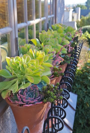 For a hard-to-water window box, Holloway chose tall, tapered terracotta pots. “Their height was right and their rolled rims repeat the iron curves,” he says. He promised the homeowner that succulents would “spark the interest of passersby” as much or more than petunias or geraniums, with significantly less hassle. (Succulents need infrequent irrigation and seldom require deadheading.) Holloway chose those that resemble flowers—rosette Echeveria in blue, pink, and green—plus Sedum rubrotinctum (pork and beans) for contrast and as a trailer. When sunlit, dramatic lime-green Echeveria pallida glows, enhancing the view from indoors.
