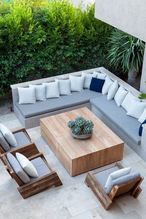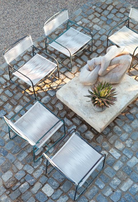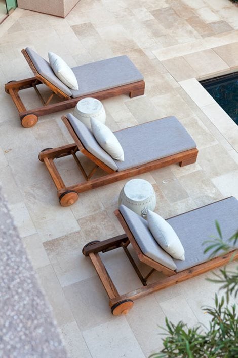 Similarly, switching up furnishings also shifts the mood as you move among gardens. Between the house and pool, he designed a custom-concrete banquette, complete with integrated side table, for informal drinks and dining. For extra seats, he added sleek yet rustic reclaimed-wood chairs by Brazilian designer Carlos Motta. Beside the pool with its polished decking, he paired Motta’s simple wood loungers with vintage, white-glazed garden stools, a contrast of shapes and surfaces that makes each element shine. Nearby, in the small gathering spot outside the living room, he surrounded the stone table (a weighty, eighteenth-century piece) with Walter Lamb’s airy 1950s tubular bronze chairs with cord seats. “Combining vintage, modern, and antique finds in natural materials warms up a contemporary garden,” notes Shrader.