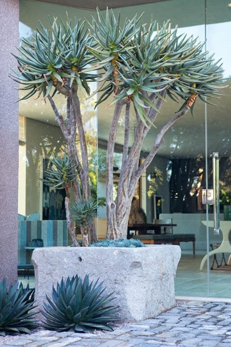 He also believes that using neutral colors keeps it quiet and serene, especially in landscapes that are organized around green. Among his first planting tasks was to hedge the front of the house from the road with a dense, enclosing waxleaf privet screen. From there, in the garden overall, different foliages, not blooms, were his focus. His short plant list includes silvery olive trees; sculptural, aqueous-toned agaves; and boxwoods sheared into globes. “This is a timeless combination that’s been used for centuries,” he explains. “It looks like it could have been done hundreds of years ago or yesterday.” The colors and textures are fully at home in California’s Mediterranean climate, particularly along the coast. Here, with the glass doors open, reflected sunlight shimmers in through the olive trees and their rustling leaves join the sound of waves on the beach.