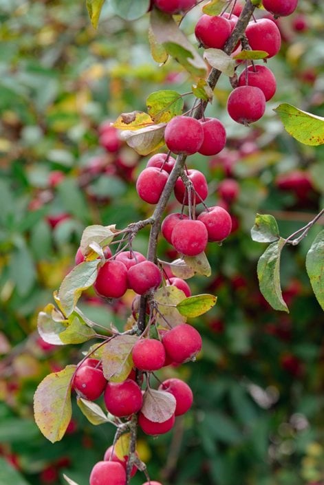 Ripens from late summer to mid-fall and often clings to the branches through winter. Usually the fruit is red, resembling small cherries, but some cultivars produce yellow, maroon, or orange fruit.