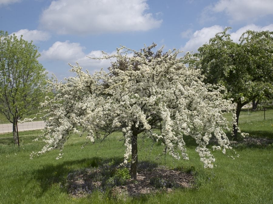Keep in mind that the fruit of crabapple trees can stain walkways or patios. To avoid that problem, choose a non-fruiting cultivar, such as ‘Prairie Rose’.