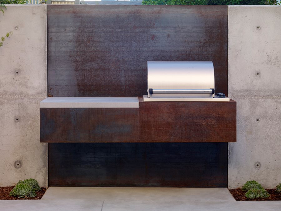 The Custom CORTEN-steel barbeque is cast into the concrete wall. Photo by: Marion Brenner.