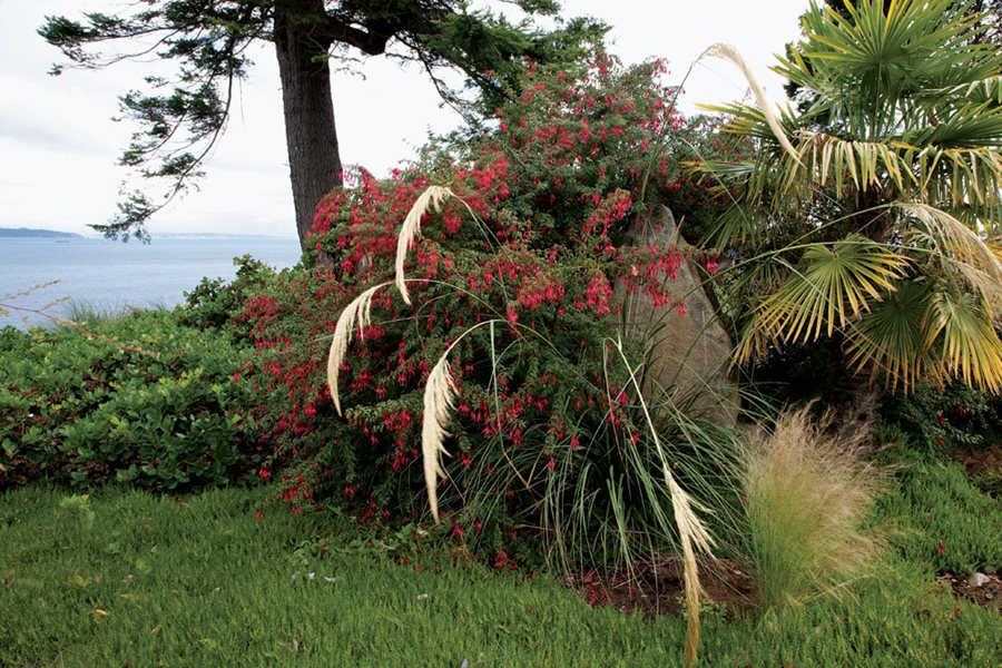 Windcliff may look out over Puget Sound and across to Seattle, but its garden is the result of three decades of plant collecting around the globe. Here, a Magellan fuchsia (Fuchsia magellanica) from the mild rainforests of southern Chile shoulders up to New Zealand toetoe grass (Austroderia fulvida), a hardy Chinese windmill palm (Trachycarpus fortunei), and salal (Gaultheria shallon), a lush shrub native to the West Coast. Photo by: Don Freeman.