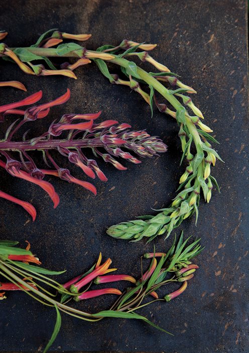 A peach-flowered lobelia (top) doesn’t merit the prominent placement of a giant variation from Chile (center), which blooms almost ceaselessly and delights hummingbirds. Lobelia laxiflora, from Mexico (bottom), earns a spot right off the main patio. Photo by: Don Freeman.