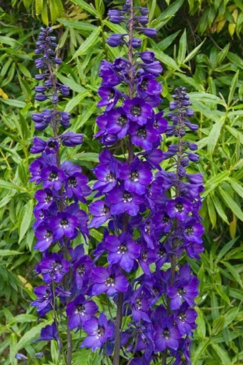 Other than the dwarf varieties, delphiniums require staking. Their hollow stems will break when blown in the wind or when the flowers become weighed down from rainfall. Stake them with sturdy supports and attach at 12- to 18-inch intervals.