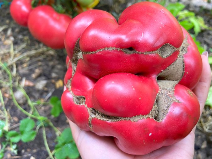 Fruits are irregularly shaped with brown scarring. This is due to catfacing, which is caused by blossom drop when temperatures fall too low. This primarily affects the first tomatoes that develop. It doesn’t affect the flavor, so fruits can still be eaten once the affected parts are cut out.