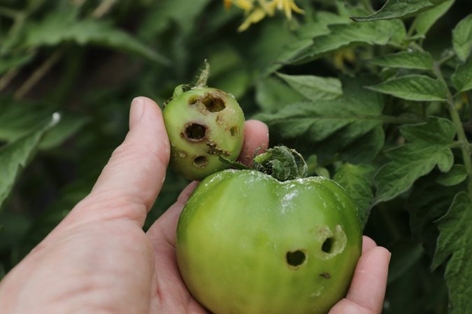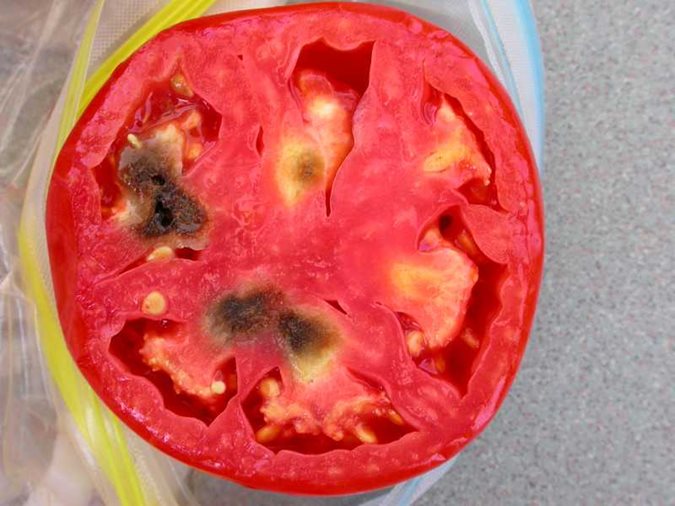 The most common cause is tomato fruit worm, which tunnels into the center of the fruit, causing it to rot.