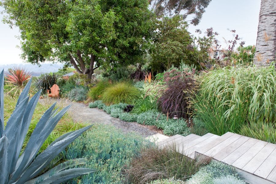 Richly layered plantings of ornamental grasses, perennials, and succulents outline the boardwalk and gravel path that lead from the house down the backyard slope. Blue chalksticks complements repeating peach-apricot highlights of Kniphofia (center) and Cordyline (far left). Designer: Debora Carl. Photo by: Richard Bloom.