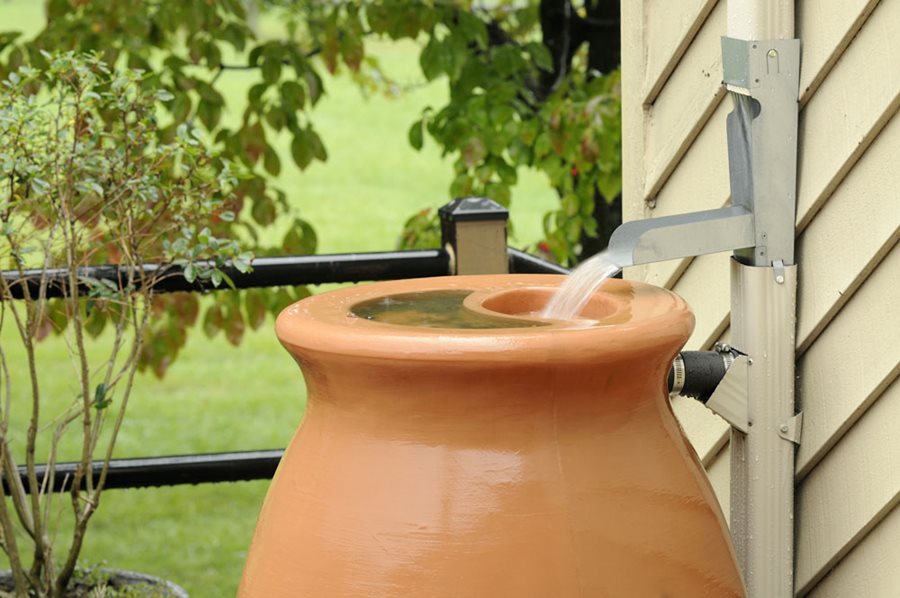 Rain barrels or cisterns collect water from gutter downspouts that can be used to water garden beds. Photo by: JuneJ / Shutterstock.