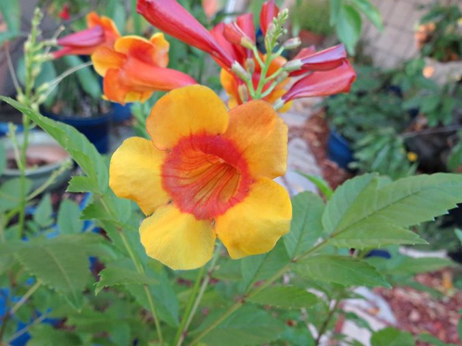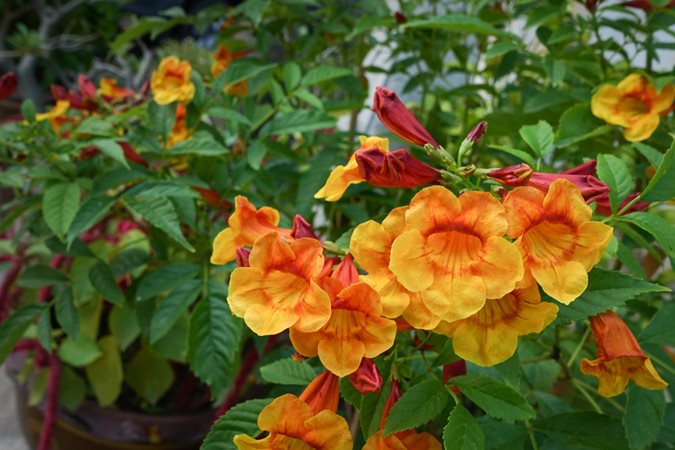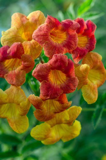 Trumpet-shaped yellow, orange, or red flowers, 3 to 5 inches long, are mildly fragrant. Flower clusters produce up to 50 blooms each. After flowering, plants produce thin bean-like seed pods that start out pale green, turning to brown.