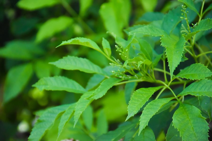 Serrated, glossy green foliage grows opposite each other along slender stems.
