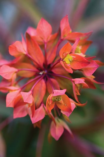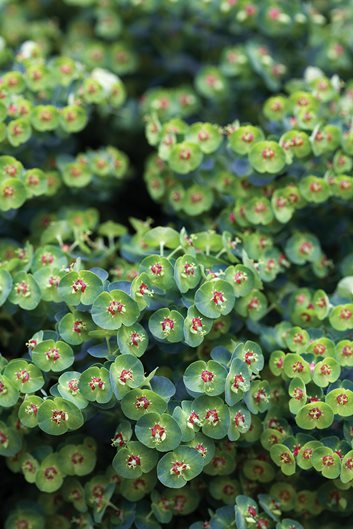 The flowers are an unusual arrangement and one of the commonalities of the euphorbia family. Most obvious in the flashy display of poinsettias, the showy parts are actually not flowers but modified leaves called bracts. The real blooms are tiny and distinctly non-flowery looking. One benefit of having bracts is that the floral heads continue to be showy long after the flowers themselves have done their thing. Another common factor among euphorbias is the milky sap that runs through their veins, which is poisonous and a skin irritant. But what makes them toxic also makes them deer resistant—a big bonus. Add to that drought and heat tolerant, long blooming and low maintenance, and you’ve got a nonpareil perennial.