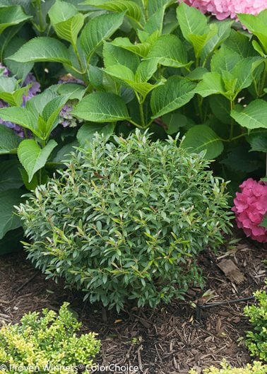This dwarf evergreen is native to North America and makes a great alternative to boxwood. Inkberry grows in a dense, ball shape with good branching right to the ground so it never looks bare-legged.