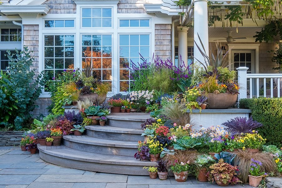 Arrange multiple containers, each with a single plant, to create a large composition. “You can move them around to try different looks,” explains Schrader. - THINK OF A CONTAINER AS AN INTRODUCTION TO THE REST OF THE GARDEN