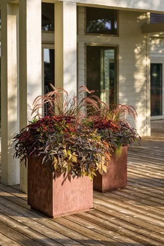 Croton (look for the upright leaves with red undersides) is usually grown as a houseplant. But we've spotted it in many fall containers this year and think it makes a wonderful addition!