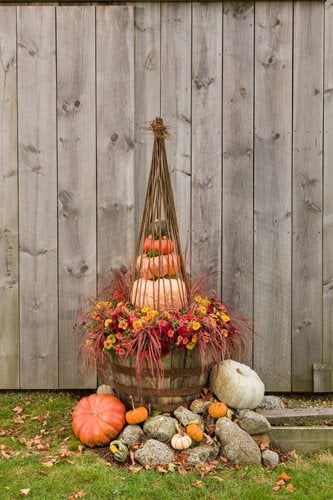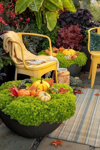 Fill a wide pot with lush green sedum, then top with pumpkins, gourds and fall leaves for a fresh take on autumn.