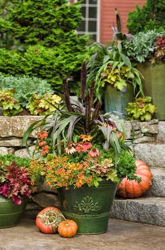 “When summer ends there is no reason to cart off pots and containers in preparation for winter,” says Dennis Schrader of Landcraft Environments, Ltd. in New York. “Autumn is a perfect time to design and plant interesting combinations that mirror the colors, shades, and textures of the season.”