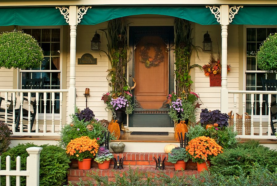 This welcoming front porch is adorned with fall-themed potted plants and decorative accessories. Designers: Rob Saba and Mark Hogan. Photo: Janet Loughrey.