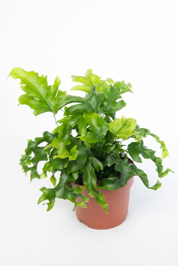 Fronds are ruffled and scalloped, forming a dense compact clump. New leaves are pale green, developing a blue-green patina as they age. Blue star fern is an epiphyte with fuzzy creeping rhizomes that emerge from the base. Use as a tabletop decoration for an office or a humid area such as a bathroom.