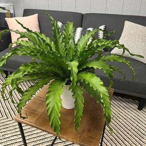 Glossy bright green leaves with wavy edges grow into a uniform rosette with a nest-like center, hence the common name. The palm-like shape is attractive when displayed as a tabletop specimen in an office or living room. Provide good drainage for this epiphyte and place in a north facing window or other low light area.