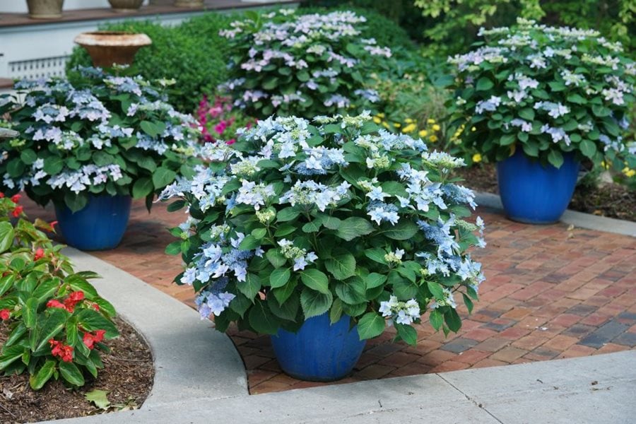 Fertilizing hydrangeas in containers is a bit different than fertilizing those planted directly in the ground. If your potting soil contains slow release fertilizer you can fertilize less often. Shown here: Tuff Stuff Ah-Ha® reblooming mountain hydrangea (Hydrangea serrata). Photo by: Proven Winners.