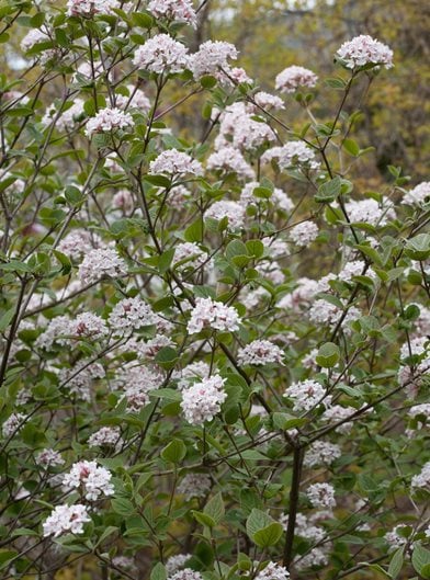 This showy shrub produces clusters of pastel-pink buds in late March that open to domed clusters of white or pink-flushed flowers. However, it’s the heady fragrance, similar to spice cake, that makes this exceptional species a delightful addition to the garden. Learn more about growing viburnum shrubs.
