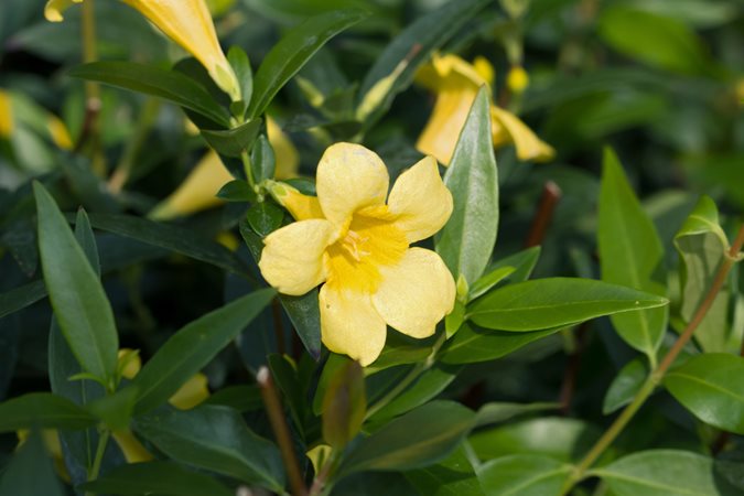 Native to parts of the southern U.S., Carolina jessamine flowers from late winter to early spring before many other plants are in bloom. Also known as Carolina yellow jasmine, this evergreen or semi-evergreen vine produces prolific clusters of golden yellow trumpet-shaped flowers that are sweetly scented. Can be grown up a sturdy arbor or pergola, or allowed to sprawl as a groundcover. Use as a privacy screen or to hide an unsightly feature such as a chainlink fence.